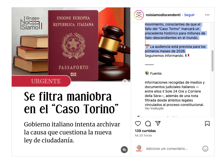La publicación refuerza el clima de expectativa e incertidumbre en torno al proceso y muestra cómo el “Caso Turín” ha superado el ámbito jurídico, convirtiéndose en tema de movilización global entre las comunidades ítalo-descendientes.