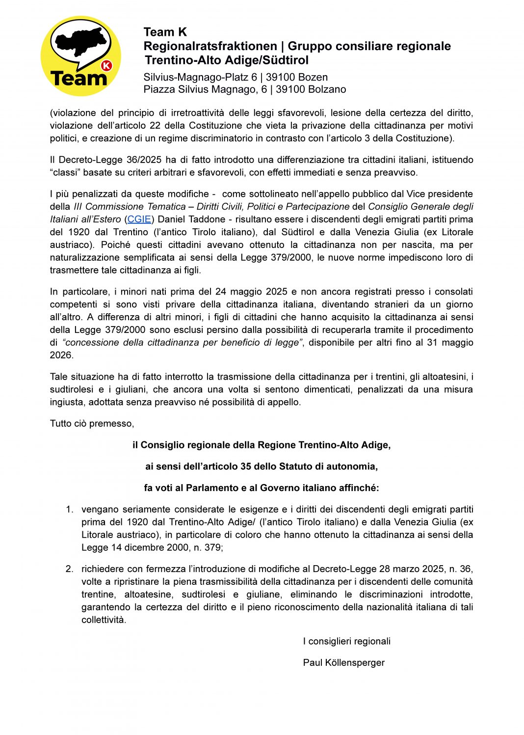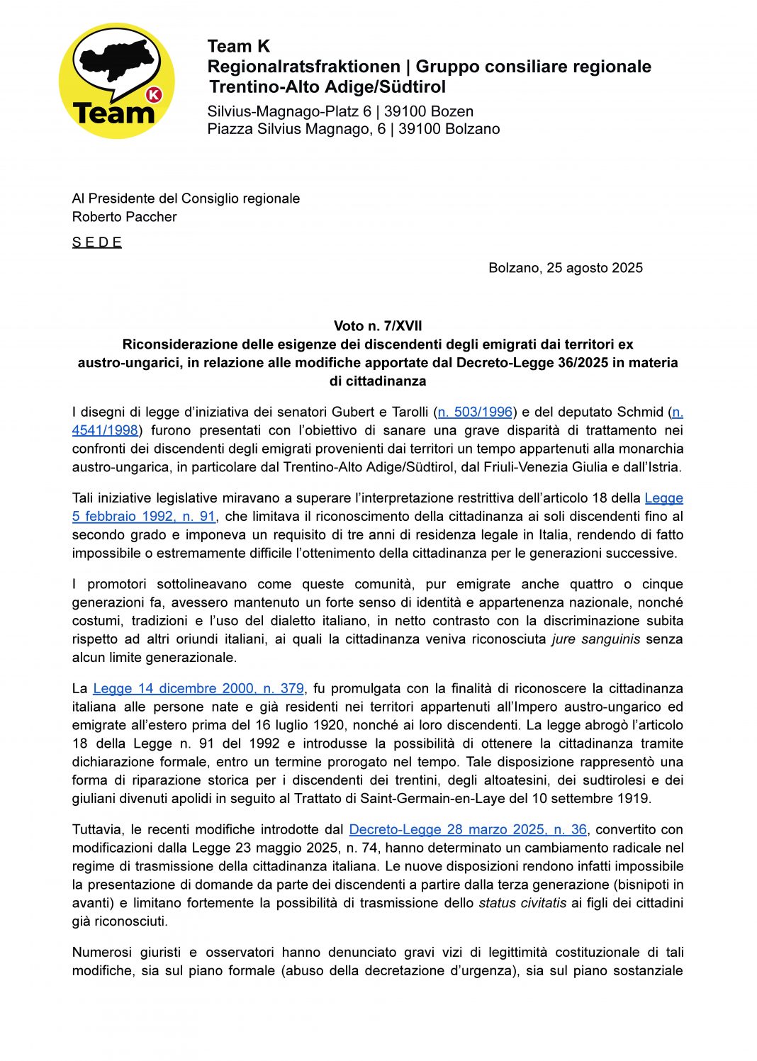 Il 25 agosto 2025, il Consiglio regionale del Trentino-Alto Adige/Südtirol ha approvato il Voto n. 7/XVII, indirizzato al Parlamento e al Governo italiano, chiedendo attenzione alle esigenze dei discendenti degli emigrati partiti prima del 1920 — in particolare ai beneficiari della Legge 379/2000 — ed esigendo la modifica della Legge 74/2025, per ripristinare la piena trasmissibilità della cittadinanza ai discendenti delle comunità trentine, altoatesine, sudtirolesi e giuliane, eliminando le discriminazioni e riaffermando la certezza del diritto.