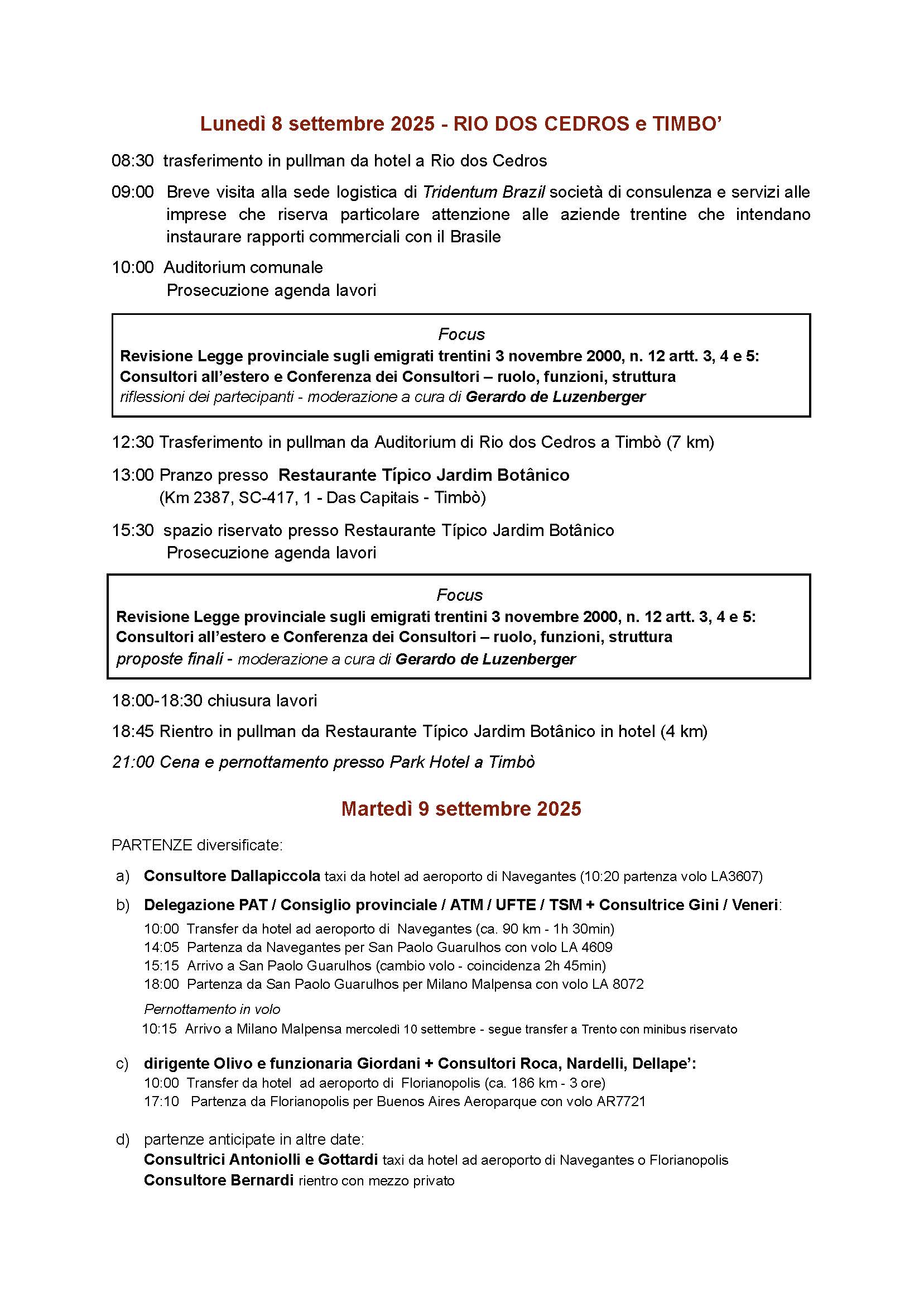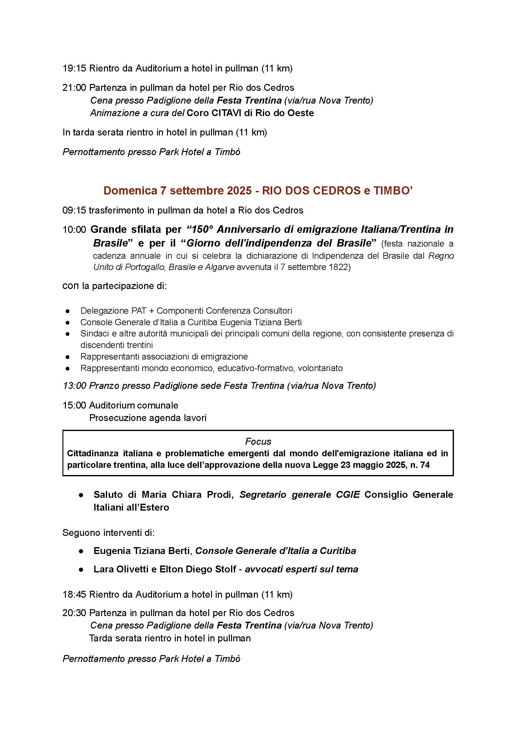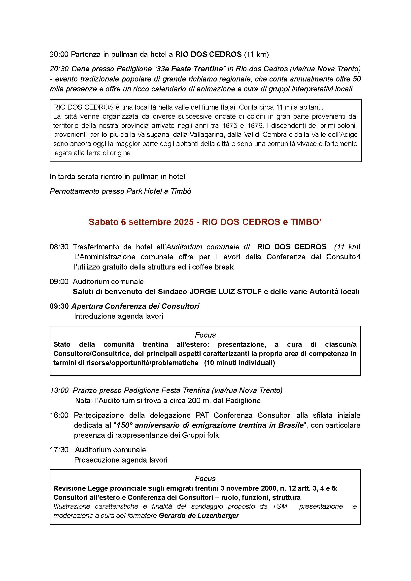 Il 5 i visitatori sono stati a Rodeio, partecipando alla Festa Trentina e a presentazioni culturali; nei giorni successivi ci sono stati spostamenti a Rio dos Cedros e Timbó, con sessioni plenarie della Conferenza dei Consultori. All’ordine del giorno il programma elenca i seguenti temi: situazione delle comunità trentine nel mondo; revisione della legge provinciale del 2000 sugli emigrati; riflessioni sulla cittadinanza italiana dopo la Legge 74/2025.