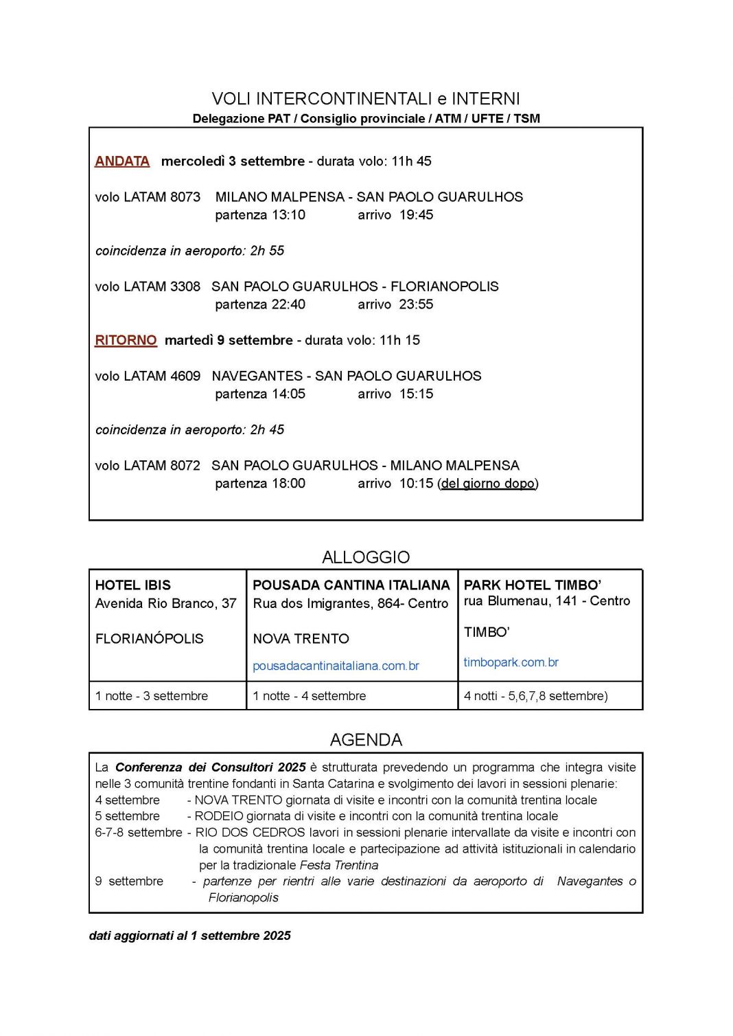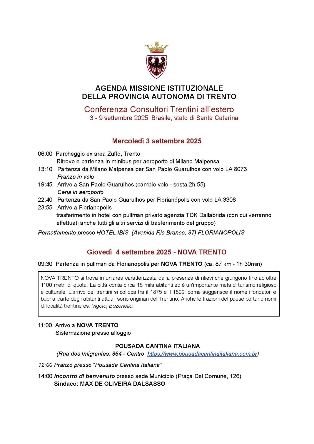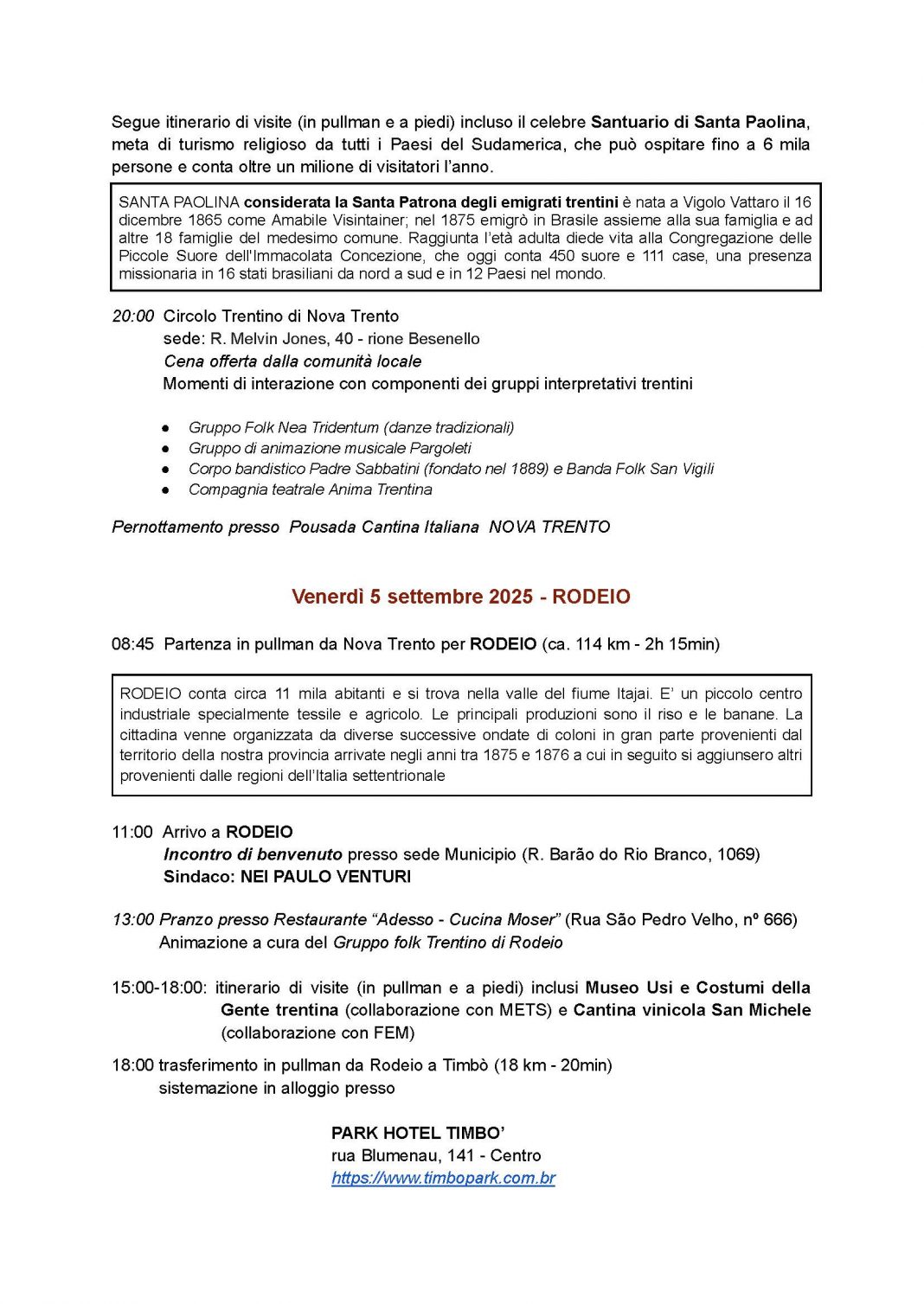 Il 5 i visitatori sono stati a Rodeio, partecipando alla Festa Trentina e a presentazioni culturali; nei giorni successivi ci sono stati spostamenti a Rio dos Cedros e Timbó, con sessioni plenarie della Conferenza dei Consultori. All’ordine del giorno il programma elenca i seguenti temi: situazione delle comunità trentine nel mondo; revisione della legge provinciale del 2000 sugli emigrati; riflessioni sulla cittadinanza italiana dopo la Legge 74/2025.