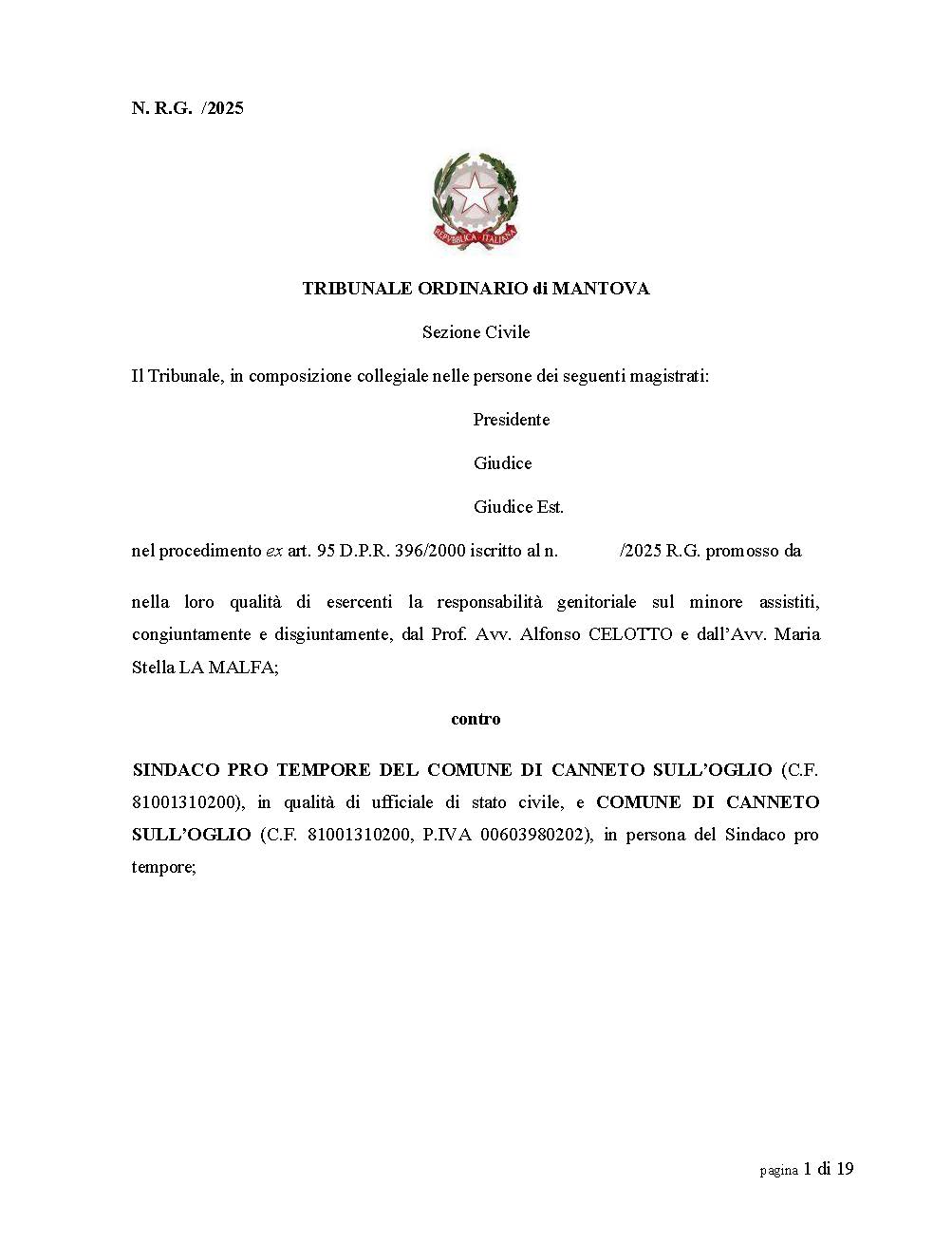 no procedimento previsto no art. 95 do D.P.R. 396/2000, inscrito sob o n. /2025 R.G., promovido por [nomes omitidos], na qualidade de exercentes da responsabilidade parental sobre o menor, assistidos conjunta e separadamente pelo Prof. Adv. Alfonso Celotto e pela Adv. Maria Stella La Malfa;