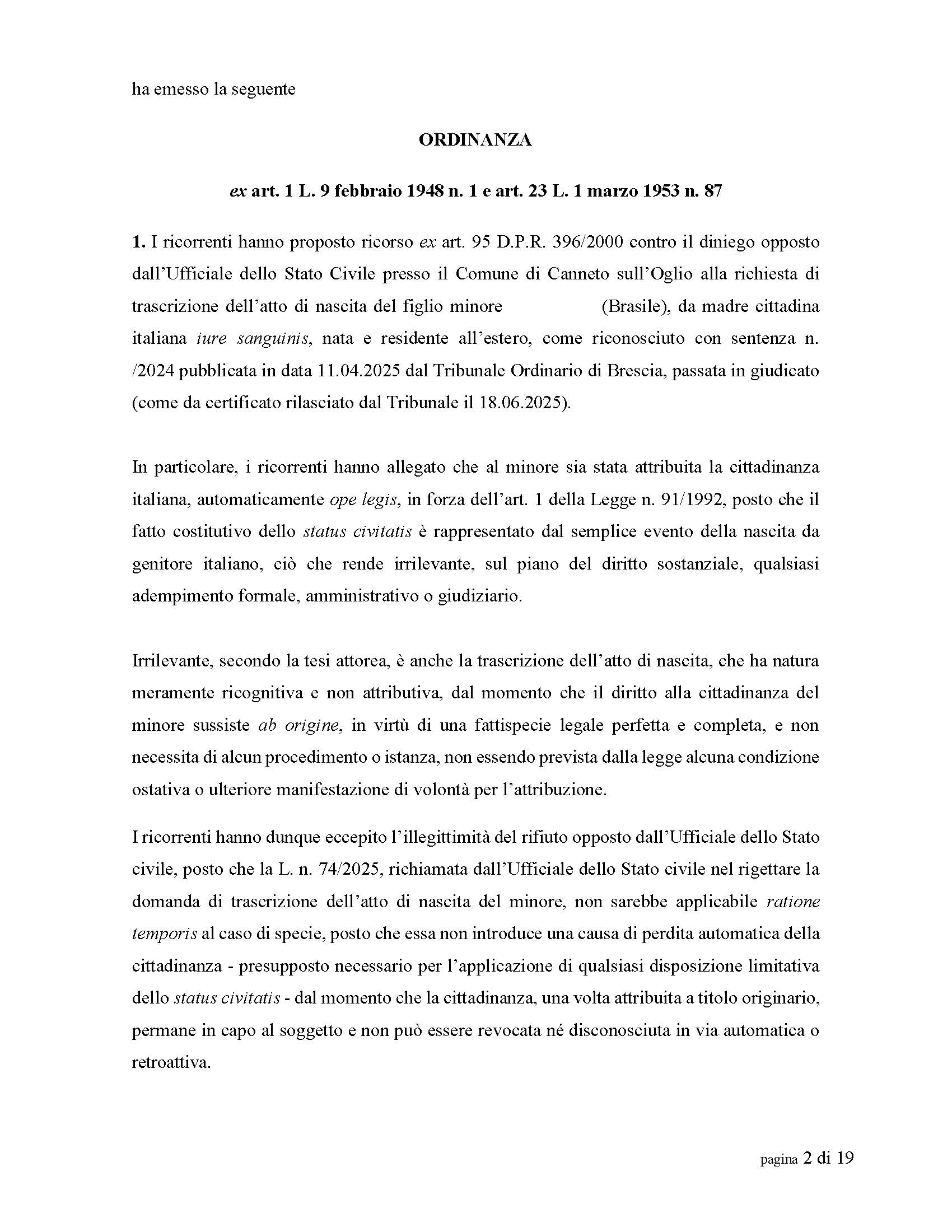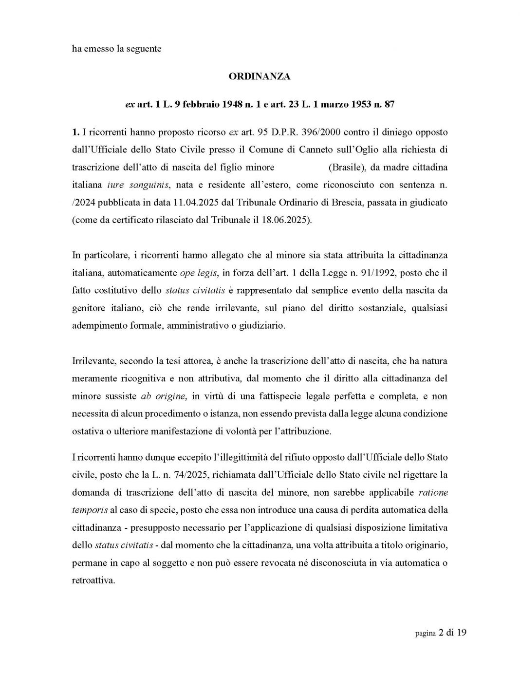 1. Os recorrentes interpuseram recurso com fundamento no art. 95 do D.P.R. 396/2000 contra a recusa oposta pelo Oficial do Estado Civil do Município de Canneto sull’Oglio ao pedido de transcrição do registro de nascimento do filho menor, nascido no Brasil, de mãe cidadã italiana iure sanguinis, nascida e residente no exterior, conforme reconhecido pela sentença n. /2024, publicada em 11.04.2025 pelo Tribunal Ordinário de Brescia e transitada em julgado (conforme certificado emitido pelo Tribunal em 18.06.2025).