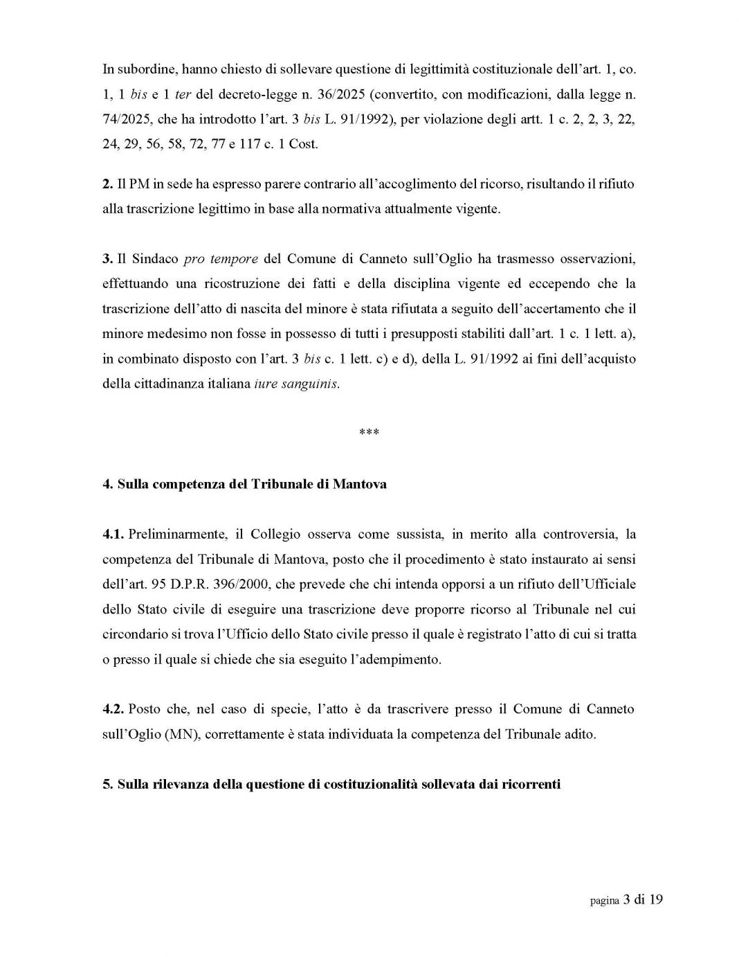 3. O Prefeito pro tempore do Município de Canneto sull’Oglio apresentou observações, realizando uma reconstrução dos fatos e da disciplina normativa vigente, e alegando que a transcrição do registro de nascimento do menor foi recusada após constatação de que o menor não possui todos os requisitos estabelecidos no art. 1 §1, letra a), combinado com o art. 3-bis §1, letras c) e d), da Lei n. 91/1992, para fins de aquisição da cidadania italiana iure sanguinis.