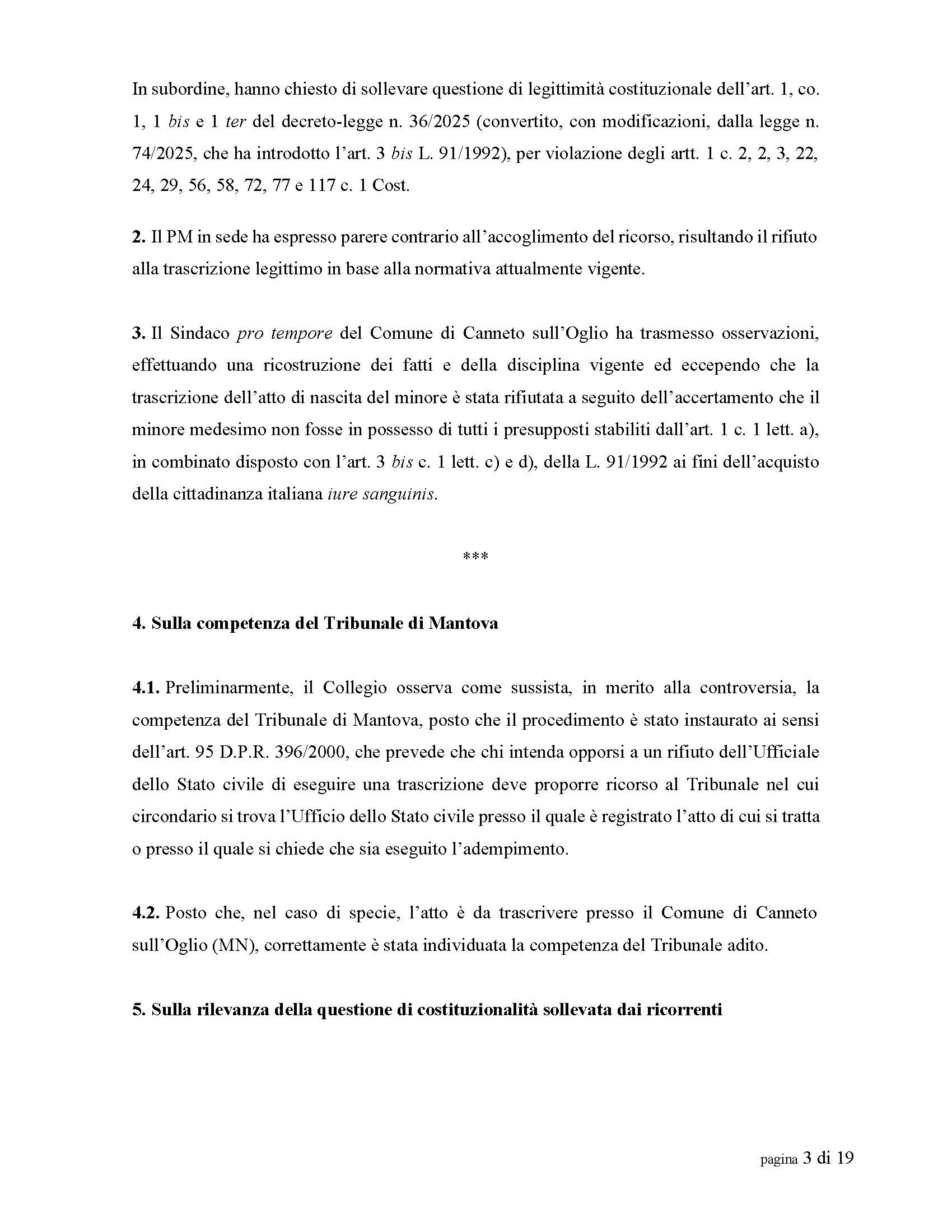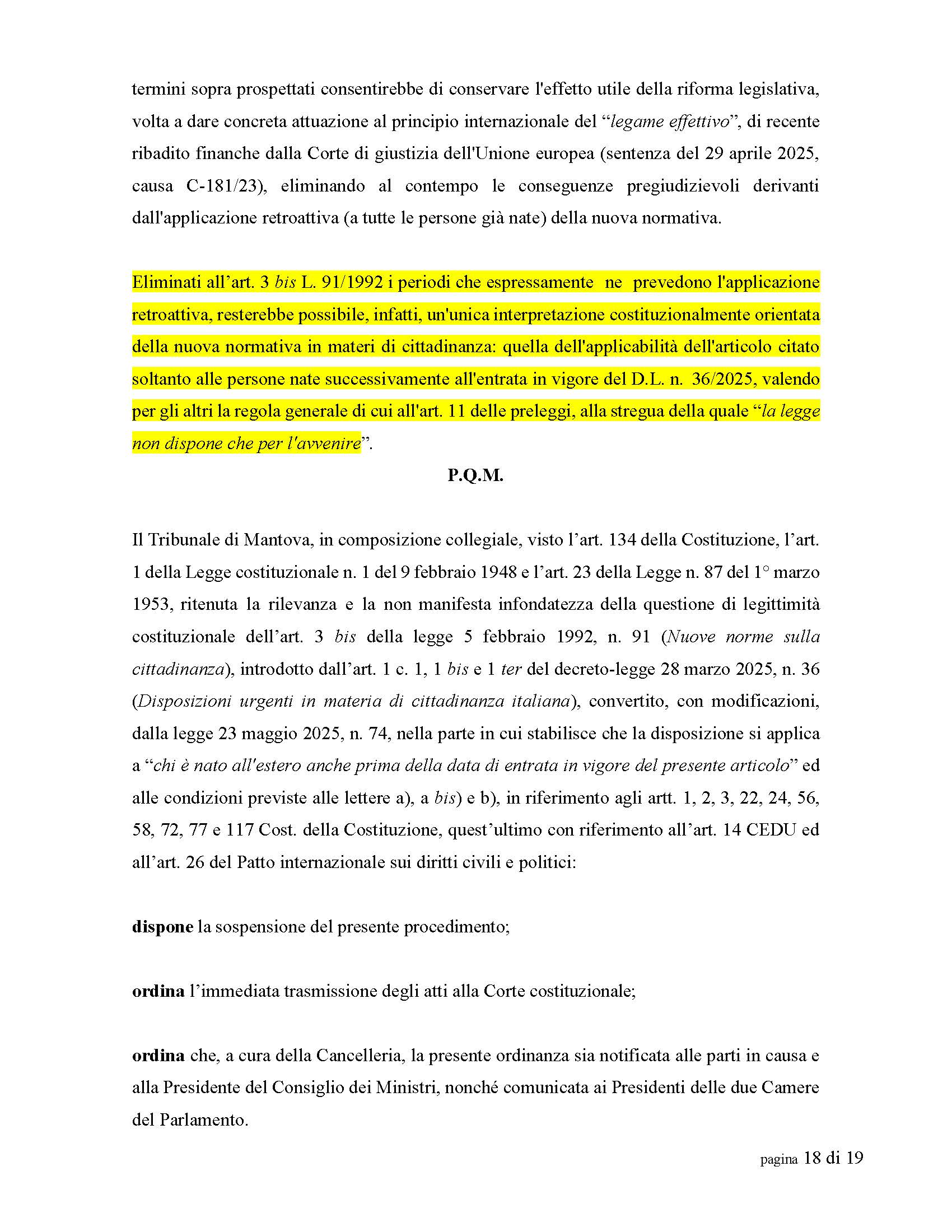 O Tribunal de Mântua, em composição colegiada, visto o art. 134 da Constituição, o art. 1 da Lei constitucional n. 1 de 9 de fevereiro de 1948 e o art. 23 da Lei n. 87 de 1º de março de 1953, considerada a relevância e a não manifesta improcedência da questão de legitimidade constitucional do art. 3-bis da Lei n. 91 de 5 de fevereiro de 1992 (Novas normas sobre cidadania), introduzido pelos §§ 1, 1-bis e 1-ter do Decreto-Lei n. 36 de 28 de março de 2025 (Disposições urgentes em matéria de cidadania italiana), convertido, com modificações, pela Lei n. 74 de 23 de maio de 2025, na parte em que estabelece que a disposição se aplica a “quem nasce no exterior mesmo antes da data de entrada em vigor do presente artigo” e às condições previstas nas letras a), a-bis) e b), com referência aos arts. 1, 2, 3, 22, 24, 56, 58, 72, 77 e 117 da Constituição, sendo este último com referência ao art. 14 da CEDH e ao art. 26 do Pacto Internacional sobre Direitos Civis e Políticos: