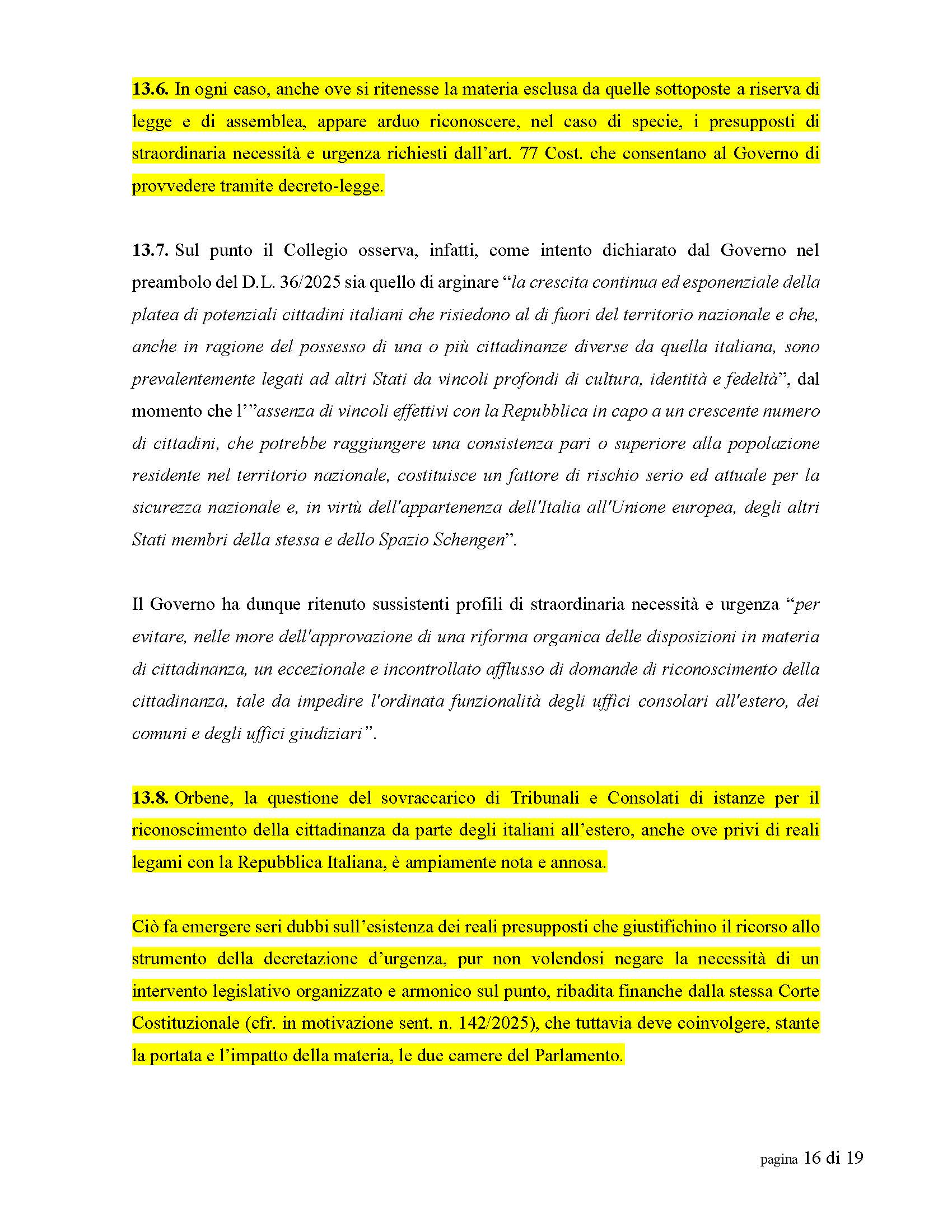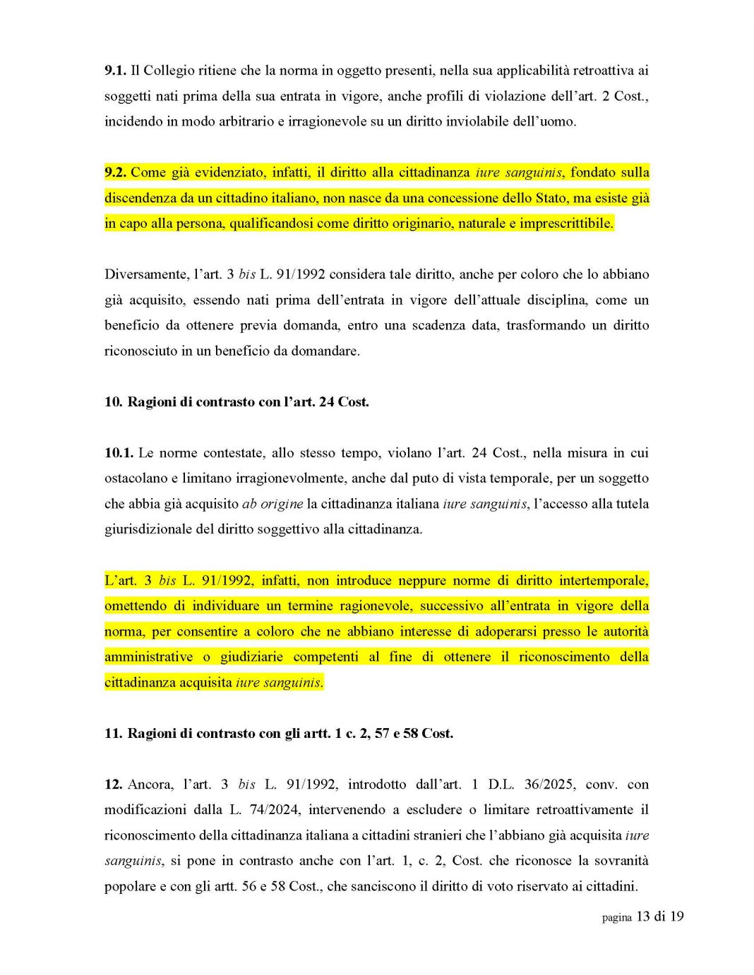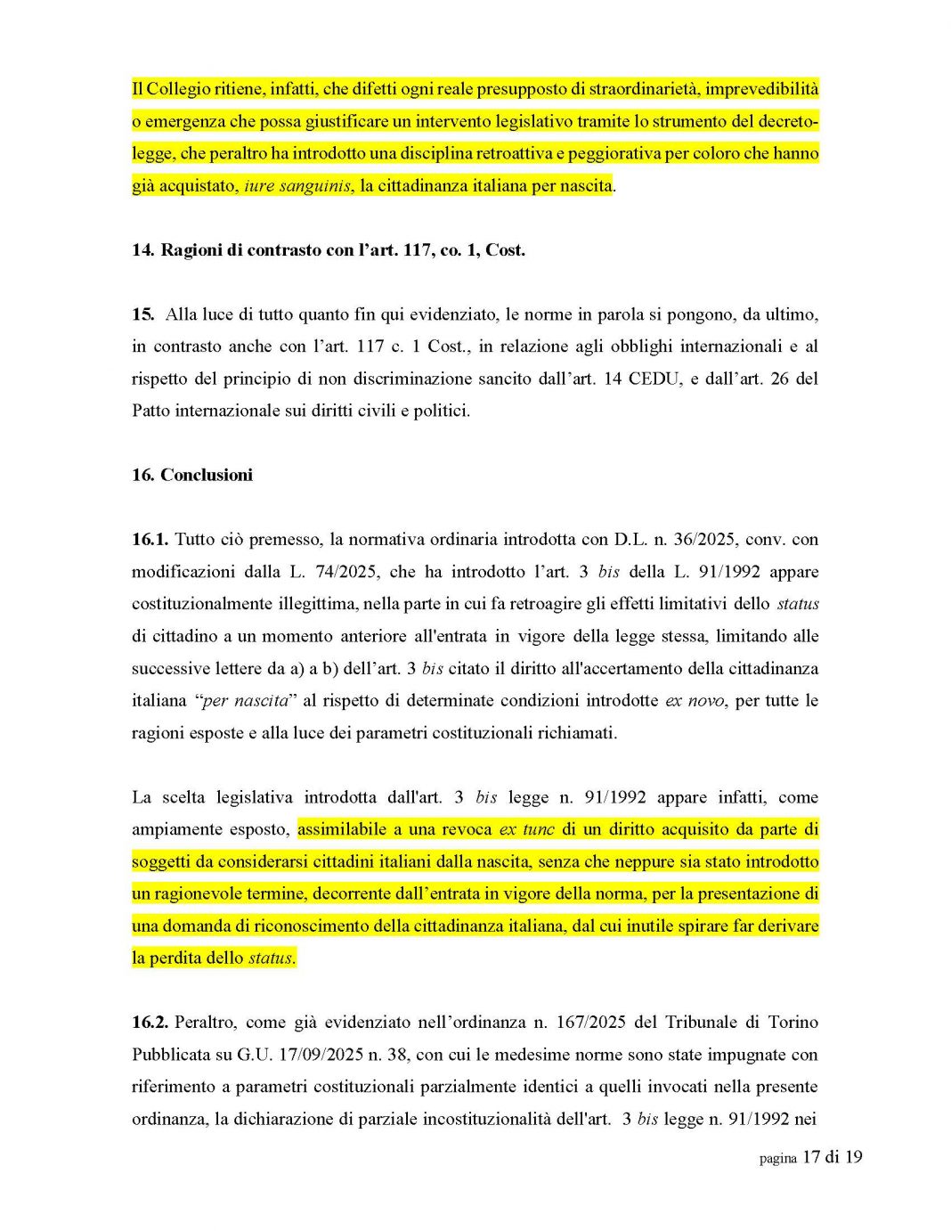 16.1. Tudo o que foi exposto considerado, a normativa ordinária introduzida pelo Decreto-Lei n. 36/2025, convertida com modificações pela Lei n. 74/2025, que introduziu o art. 3-bis da Lei n. 91/1992, revela-se constitucionalmente ilegítima, na parte em que retroage os efeitos limitativos do status de cidadão a momento anterior à entrada em vigor da própria lei, condicionando o direito ao reconhecimento da cidadania italiana “por nascimento”, conforme as subsequentes letras de a) a b) do já citado art. 3-bis, ao cumprimento de determinadas condições introduzidas ex novo, por todas as razões expostas e à luz dos parâmetros constitucionais mencionados.