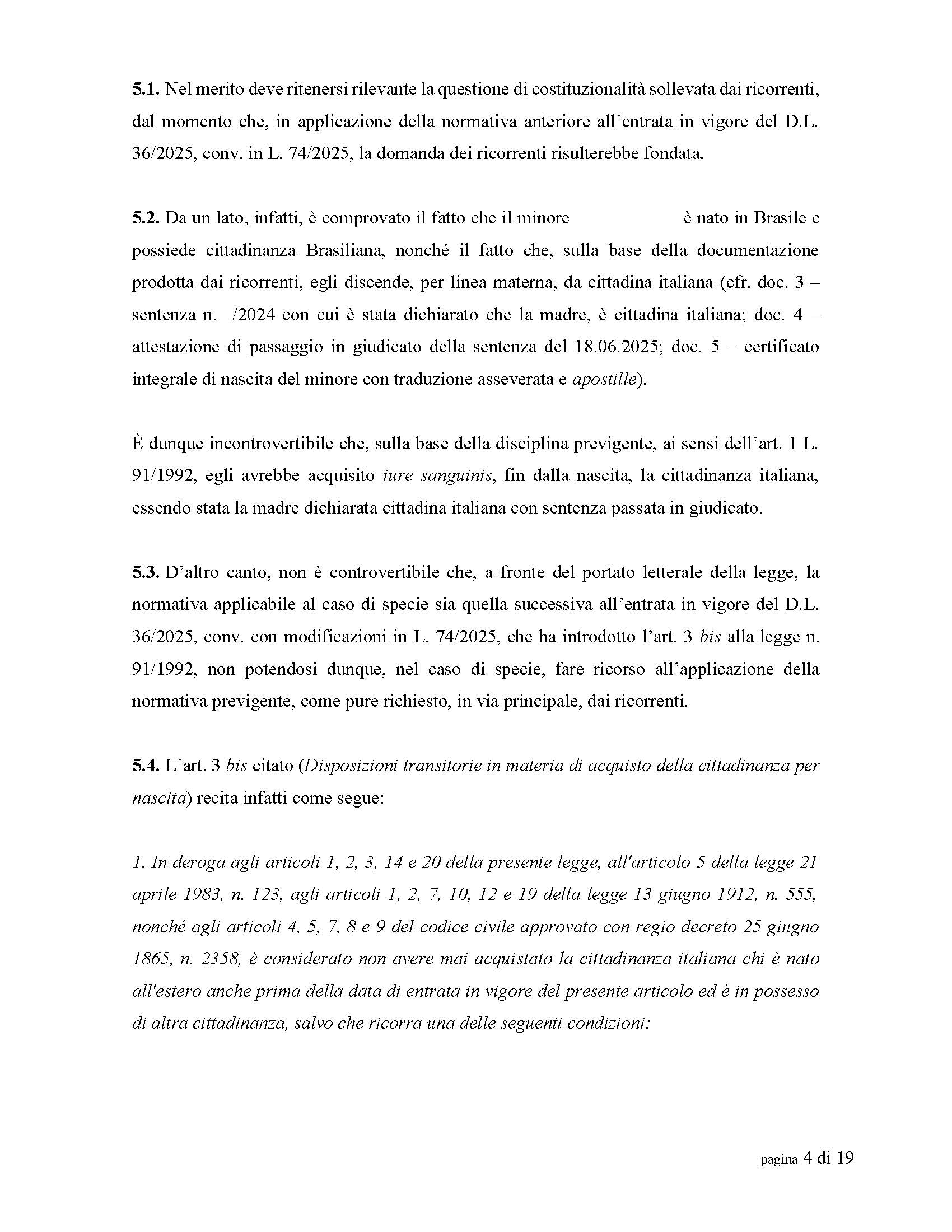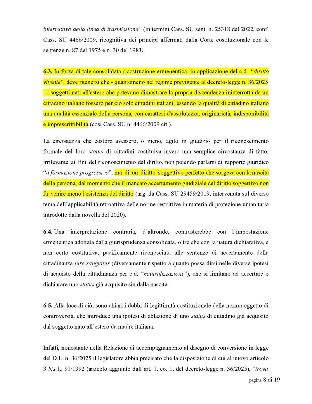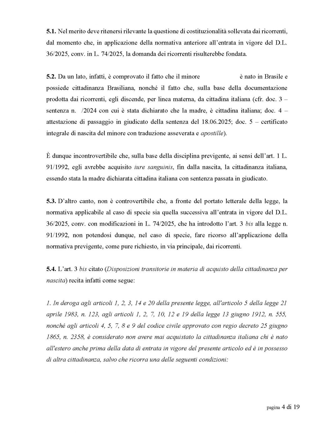 16.1. Tudo o que foi exposto considerado, a normativa ordinária introduzida pelo Decreto-Lei n. 36/2025, convertida com modificações pela Lei n. 74/2025, que introduziu o art. 3-bis da Lei n. 91/1992, revela-se constitucionalmente ilegítima, na parte em que retroage os efeitos limitativos do status de cidadão a momento anterior à entrada em vigor da própria lei, condicionando o direito ao reconhecimento da cidadania italiana “por nascimento”, conforme as subsequentes letras de a) a b) do já citado art. 3-bis, ao cumprimento de determinadas condições introduzidas ex novo, por todas as razões expostas e à luz dos parâmetros constitucionais mencionados.