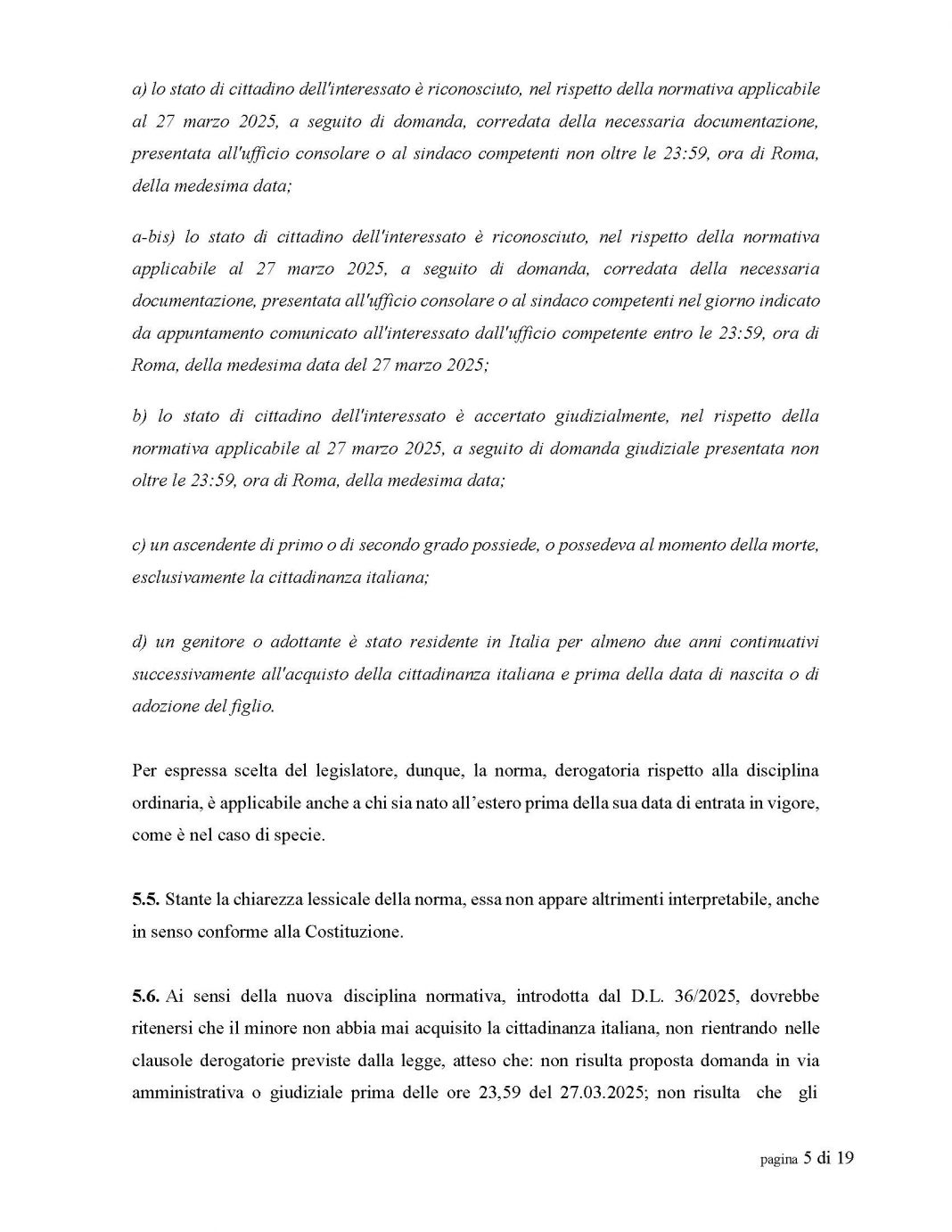 5.3. Por outro lado, é igualmente incontroverso que, diante do teor literal da lei, a normativa aplicável ao caso concreto é aquela posterior à entrada em vigor do Decreto-Lei n. 36/2025, convertido com modificações na Lei n. 74/2025, que introduziu o art. 3-bis na Lei n. 91/1992, não sendo possível aplicar no caso a normativa anterior, como pretendido, em caráter principal, pelos recorrentes.