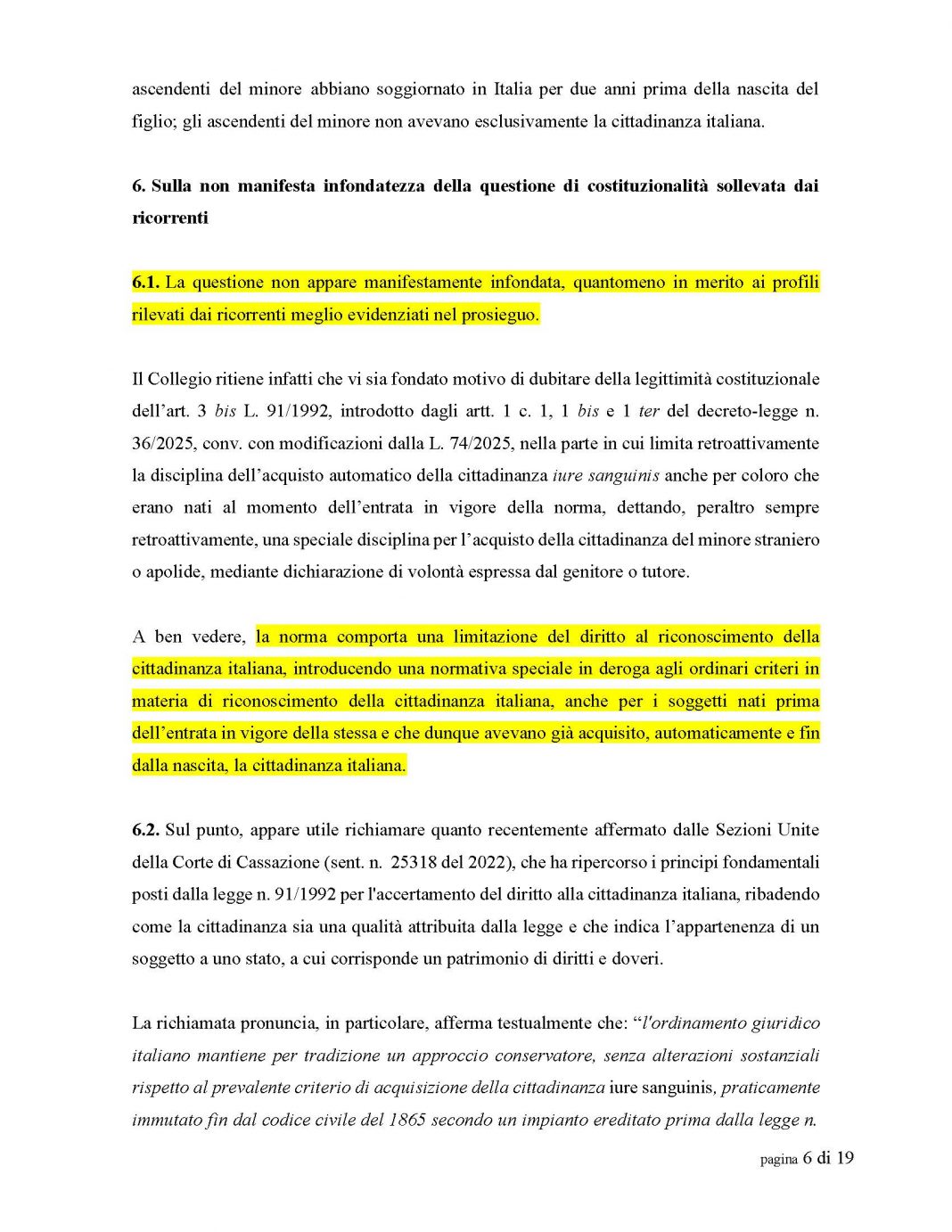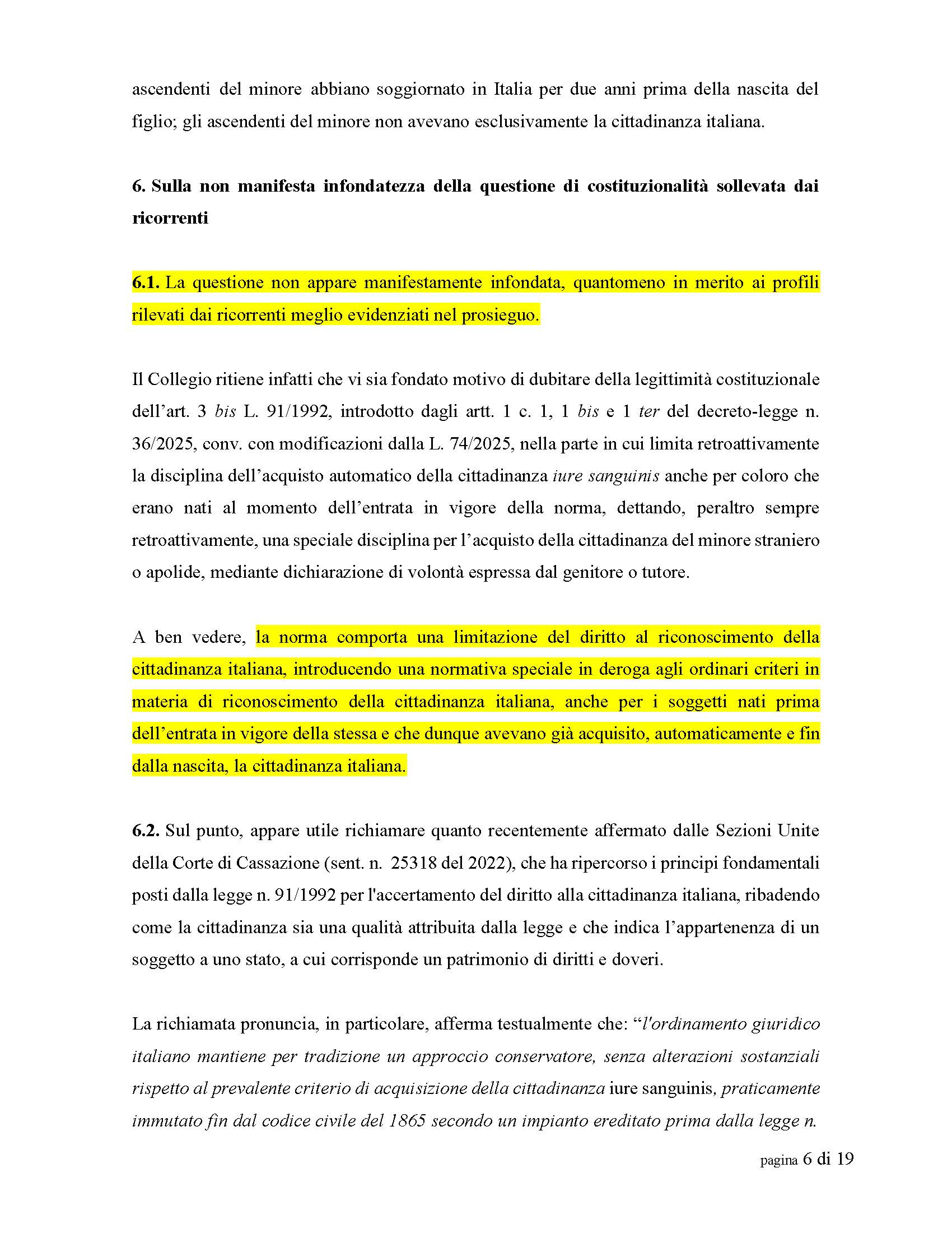 O Colegiado entende, com efeito, que há fundada razão para duvidar da constitucionalidade do art. 3-bis da Lei n. 91/1992, introduzido pelos arts. 1 §1, 1-bis e 1-ter do Decreto-Lei n. 36/2025, convertido com modificações na Lei n. 74/2025, na parte em que limita retroativamente a disciplina da aquisição automática da cidadania iure sanguinis inclusive para aqueles que já eram nascidos ao tempo da entrada em vigor da norma, instituindo, ademais, sempre com efeitos retroativos, uma disciplina especial para a aquisição da cidadania do menor estrangeiro ou apátrida, mediante declaração de vontade expressa pelo genitor ou tutor.