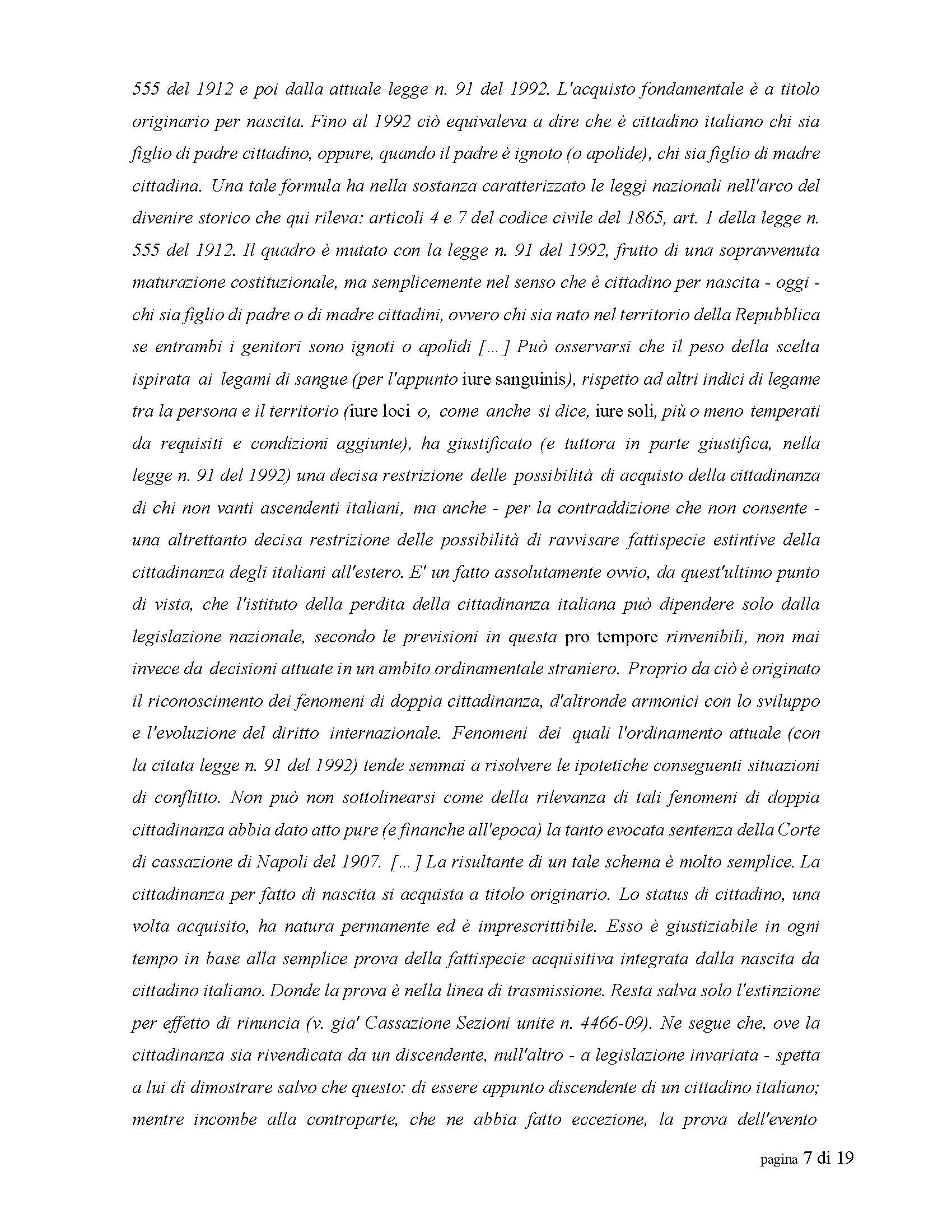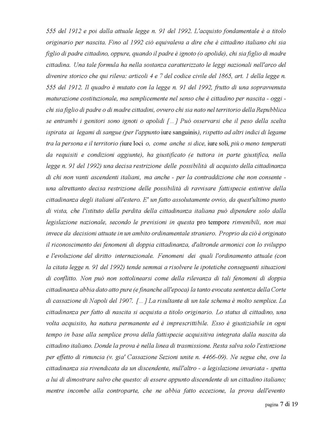 “O ordenamento jurídico italiano mantém por tradição um enfoque conservador, sem alterações substanciais quanto ao critério prevalente de aquisição da cidadania iure sanguinis, praticamente imutado desde o Código Civil de 1865 segundo uma estrutura herdada antes pela Lei n. 555 de 1912 e, depois, pela atual Lei n. 91 de 1992. A aquisição fundamental é a título originário por nascimento. Até 1992 isso significava que era cidadão italiano quem fosse filho de pai cidadão ou, quando o pai fosse desconhecido (ou apátrida), quem fosse filho de mãe cidadã. Tal fórmula caracterizou, em essência, as leis nacionais ao longo do período histórico aqui relevante: artigos 4 e 7 do Código Civil de 1865, art. 1 da Lei n. 555 de 1912. O quadro mudou com a Lei n. 91 de 1992, fruto de uma maturação constitucional superveniente, mas apenas no sentido de que é cidadão por nascimento — hoje — quem seja filho de pai ou de mãe cidadãos, ou ainda quem tenha nascido no território da República quando ambos os pais sejam desconhecidos ou apátridas […] Pode-se observar que o peso da escolha inspirada pelos laços de sangue (justamente iure sanguinis), em comparação com outros critérios de vínculo entre a pessoa e o território (iure loci ou, como também se diz, iure soli, mais ou menos atenuados por requisitos e condições adicionais), justificou (e ainda justifica, em parte, na Lei n. 91 de 1992) uma clara restrição das possibilidades de aquisição da cidadania para quem não possua ascendência italiana, mas também — como contradição que não se admite — uma igualmente clara restrição das hipóteses de se reconhecer causas extintivas da cidadania dos italianos no exterior. É um fato absolutamente óbvio, sob esse último ponto de vista, que o instituto da perda da cidadania italiana possa depender apenas da legislação nacional, conforme suas previsões vigentes ao tempo, e nunca de decisões tomadas em âmbito jurídico estrangeiro. Exatamente daí se originou o reconhecimento dos fenômenos da dupla cidadania, coerentes com o desenvolvimento e a evolução do direito internacional. Fenômenos estes para os quais o ordenamento atual (com a citada Lei n. 91 de 1992) tende, ao contrário, a dirimir eventuais situações de conflito. Deve-se notar como da relevância de tais fenômenos de dupla cidadania já dava conta também (e inclusive à época) a tão evocada sentença da Corte de Cassação de Nápoles de 1907. […] O resultado de tal esquema é muito simples. A cidadania por fato do nascimento se adquire a título originário. O status de cidadão, uma vez adquirido, tem natureza permanente e é imprescritível. Ele é suscetível de tutela jurisdicional a qualquer tempo, com base na simples prova da ocorrência da situação jurídica aquisitiva representada pelo nascimento de cidadão italiano. Daí que a prova reside na linha de transmissão. Resta apenas a possibilidade de extinção por renúncia (cf. Cassação Seções Unidas n. 4466/2009). Segue-se que, quando a cidadania seja reivindicada por um descendente, nada mais — sob a legislação invariada — cabe a ele demonstrar senão isto: ser justamente descendente de um cidadão italiano; competindo à parte contrária, que assim alegue, a prova do evento interruptivo da linha de transmissão.”