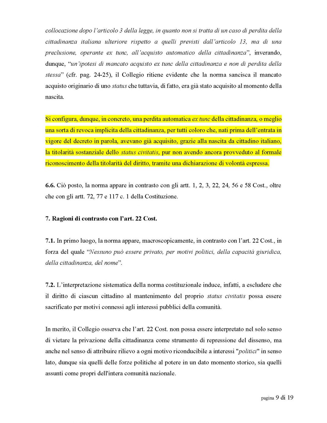 A escolha legislativa introduzida pelo art. 3-bis da Lei n. 91/1992 revela-se, com efeito, como amplamente exposto, assimilável a uma revogação ex tunc de um direito adquirido por sujeitos a serem considerados cidadãos italianos desde o nascimento, sem que tenha sequer sido introduzido um prazo razoável, a partir da entrada em vigor da norma, para a apresentação de um pedido de reconhecimento da cidadania italiana, cujo decurso infrutífero pudesse fundamentar a perda do status.