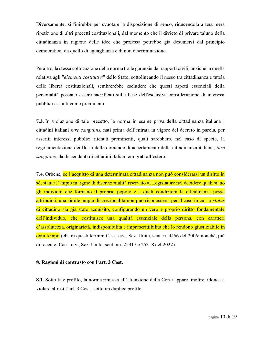10.1. As normas contestadas, ao mesmo tempo, violam o art. 24 da Constituição, na medida em que obstaculizam e limitam de modo irrazoável, também do ponto de vista temporal, para um sujeito que já tenha adquirido ab origine a cidadania italiana iure sanguinis, o acesso à tutela jurisdicional do direito subjetivo à cidadania.