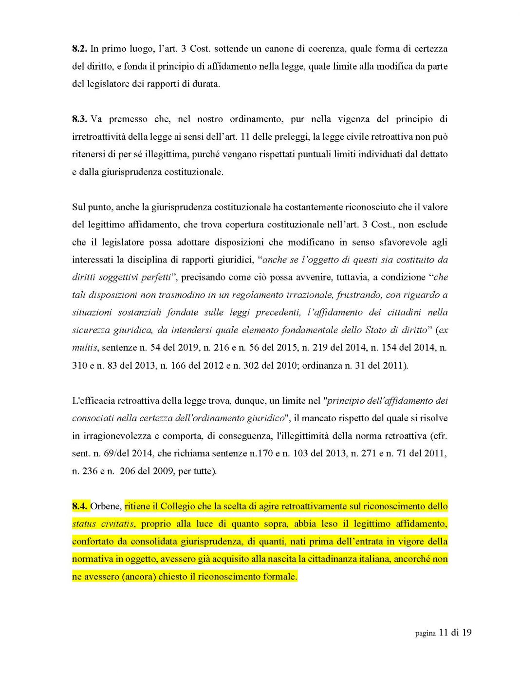 8.4. Ora, o Colegiado considera que a escolha de agir retroativamente sobre o reconhecimento do status civitatis, precisamente à luz do exposto, tenha violado a confiança legítima, amparada em jurisprudência consolidada, daqueles que, nascidos antes da entrada em vigor da normativa em questão, já haviam adquirido, ao nascer, a cidadania italiana, ainda que não tivessem (ainda) solicitado o reconhecimento formal.