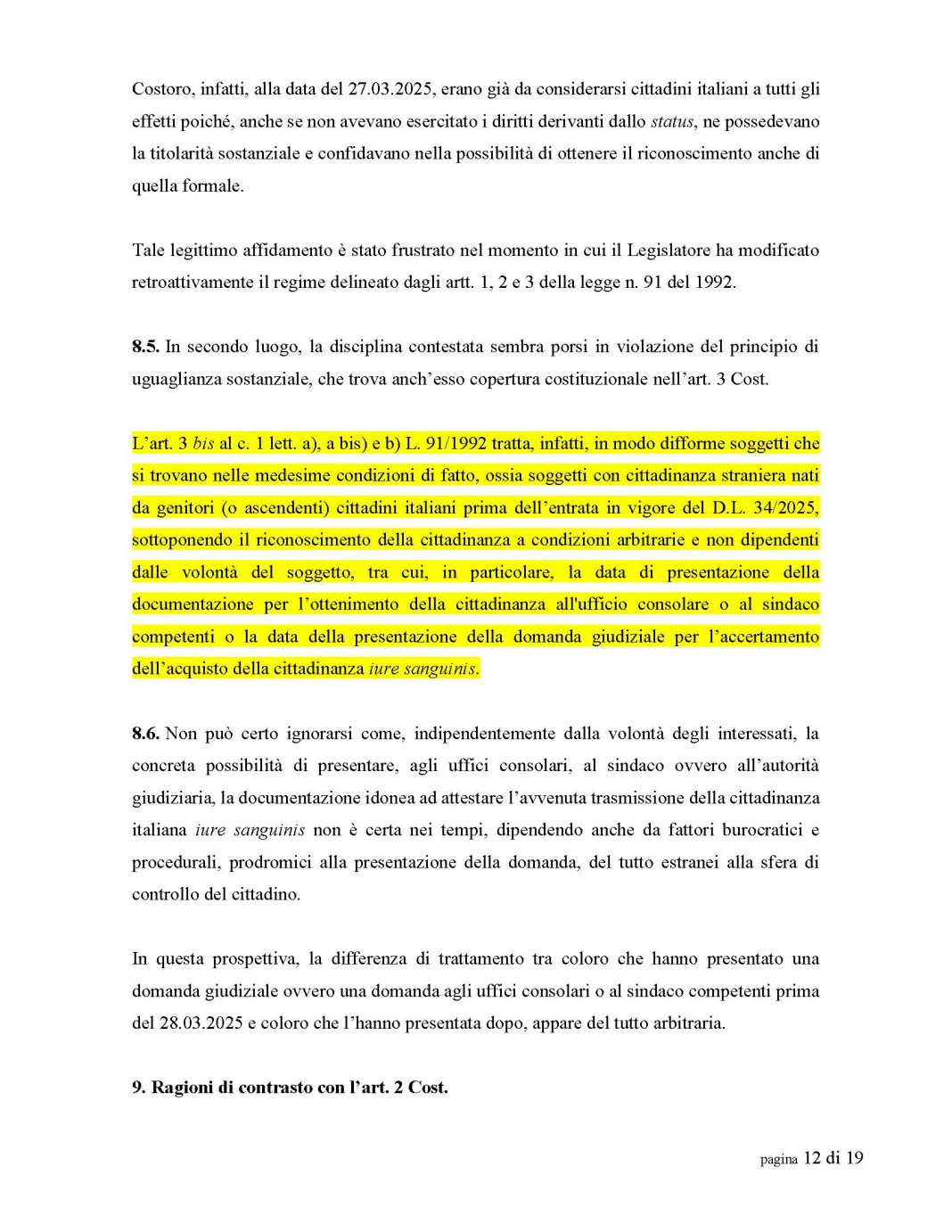 Com efeito, tais pessoas, na data de 27.03.2025, já deviam ser consideradas cidadãos italianos para todos os efeitos, pois, ainda que não tivessem exercido os direitos decorrentes do status, deles eram titulares substanciais e confiavam na possibilidade de obter também o reconhecimento formal. Tal confiança legítima foi frustrada quando o Legislador modificou retroativamente o regime delineado pelos arts. 1º, 2º e 3º da Lei n. 91 de 1992.