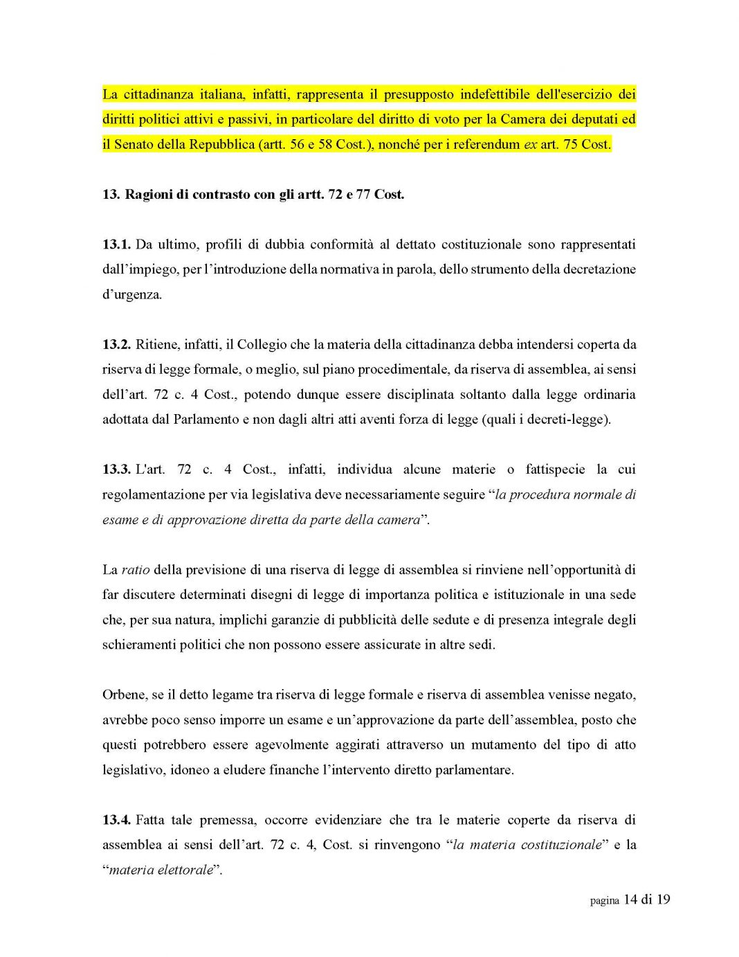 12. Ainda, o art. 3-bis da Lei 91/1992, introduzido pelo art. 1 do Decreto-Lei 36/2025, convertido com modificações pela Lei 74/2024, ao intervir para excluir ou limitar retroativamente o reconhecimento da cidadania italiana a cidadãos estrangeiros que já a tenham adquirido iure sanguinis, coloca-se também em contraste com o art. 1, § 2, da Constituição, que reconhece a soberania popular, e com os arts. 56 e 58 da Constituição, que sancionam o direito de voto reservado aos cidadãos.
