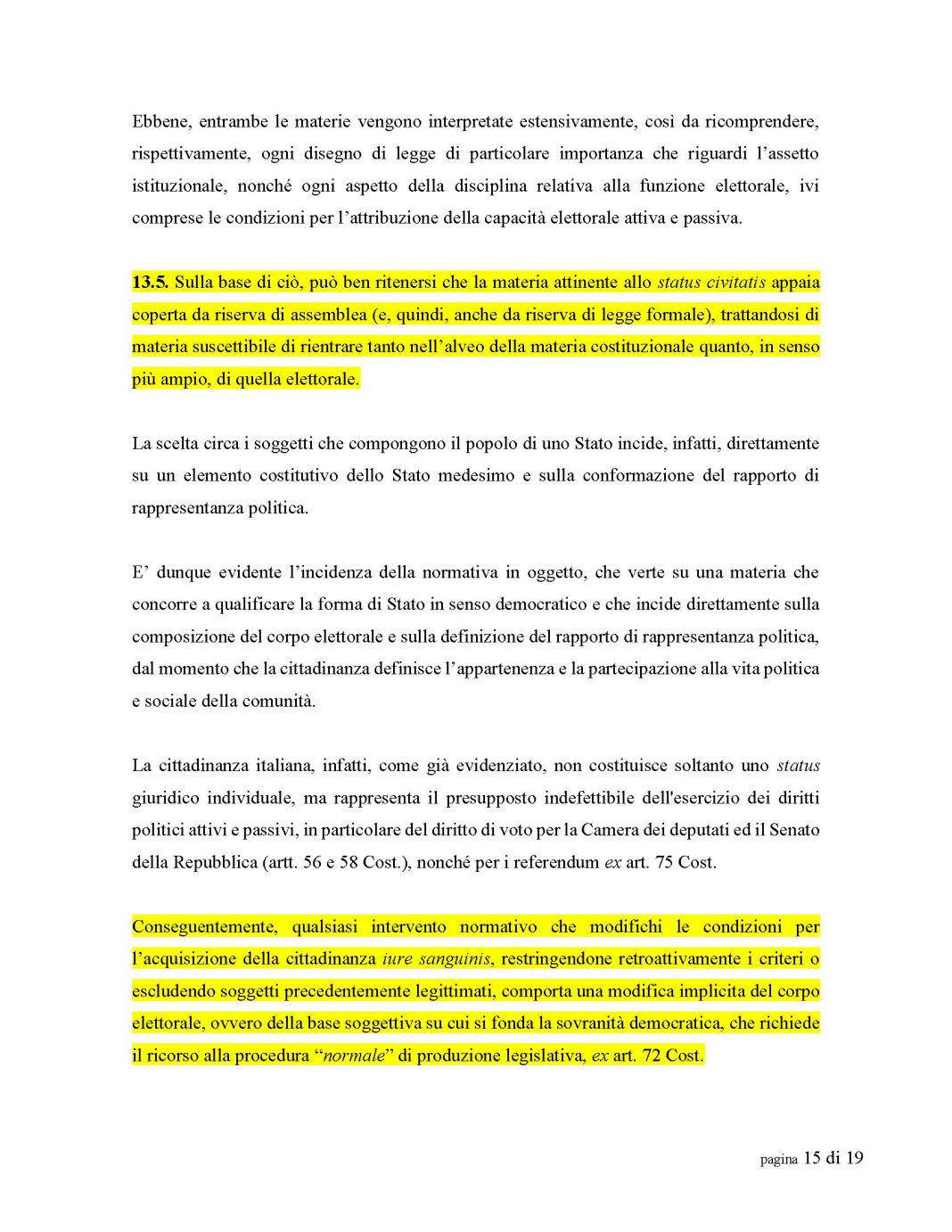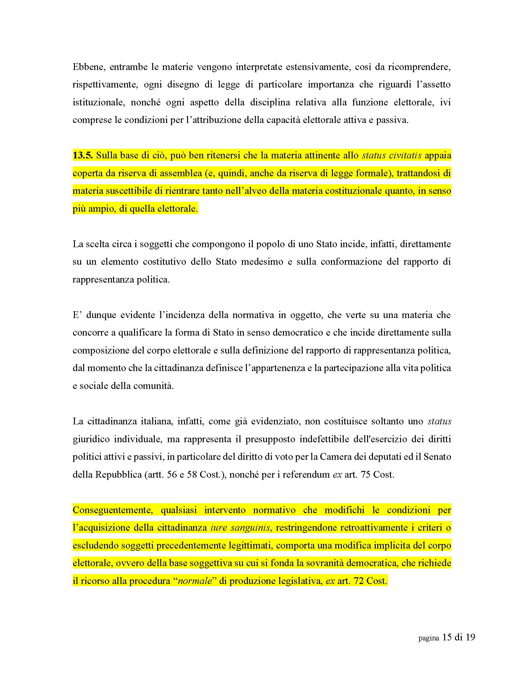 É, portanto, evidente a incidência da normativa em questão, que versa sobre uma matéria que concorre para qualificar a forma de Estado em sentido democrático e que incide diretamente sobre a composição do corpo eleitoral e sobre a definição da relação de representação política, uma vez que a cidadania define a pertença e a participação na vida política e social da comunidade.